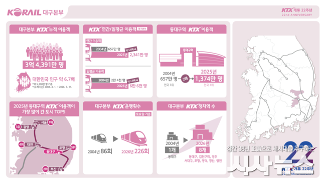 한편, 코레일 대구본부는 KTX 개통 22주년을 맞아 4월 1일 동대구역에서 고객 감사 행사를 개최했으며, 4월 1일부터 22일까지 코레일 대구본부 인스타그램(@korail_daegu_)을 통해 온라인 OX 퀴즈 및 설문 참여 이벤트를 진행 중이다.