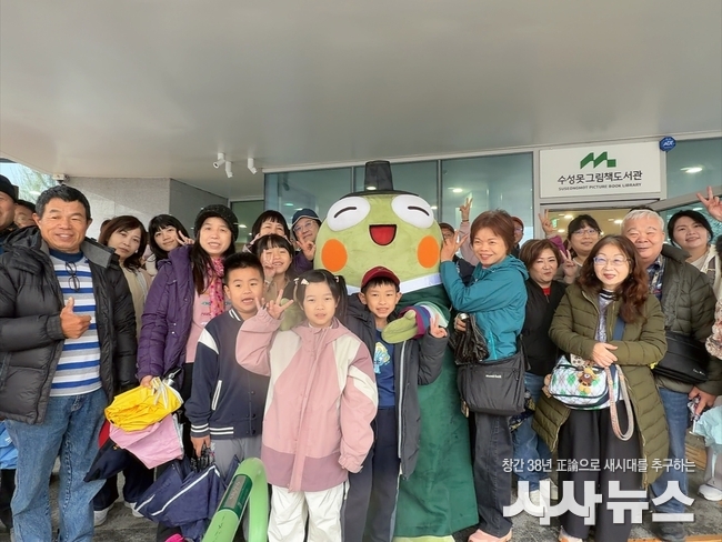 관광객들은 수성못 그림책도서관에서 수성구 캐릭터 ‘뚜비’의 환영을 받고, ‘뚜비 느린 우체통’을 활용한 그림엽서 그리기 체험에 참여했다.