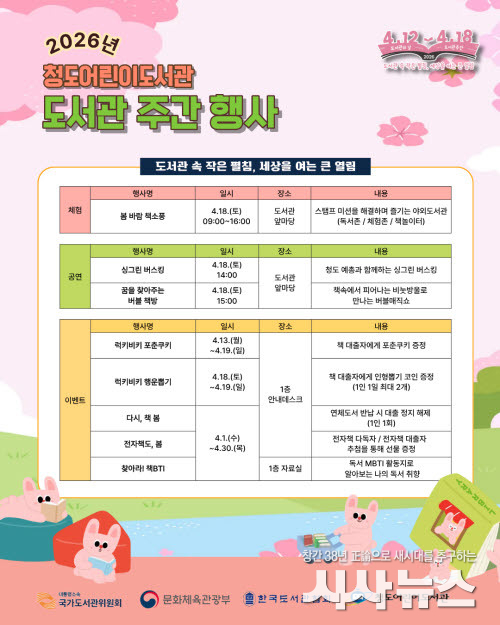 특히, 청도어린이도서관은 색다른 독서경험을 제공하기 위해 야외도서관을 테마로 한 「봄바람 책소풍」을 18일 운영한다. 이번 행사에서는 ▲ 독서존 체험부스 책놀이터로 구성된 야외도서관 ▲ 6가지 미션을 수행하는 「스탬프 미션」이벤트 ▲ 싱그린 버스킹 및 독서권장 버블쇼 등 무대공연 ▲ 행운의 독서뽑기, 리사이클링 드로잉 등 부대행사가 진행될 예정이다.