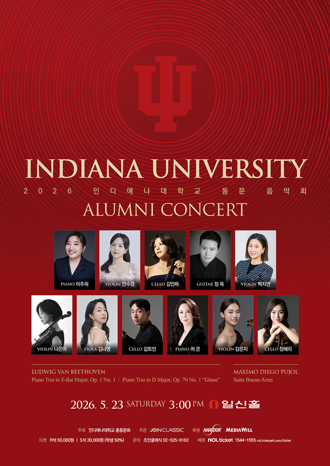 [시사뉴스 정춘옥 기자] 2026 인디애나대학교 동문 음악회(2026 Indiana University Alumni Concert)가 5월 23일(토) 오후 3시 서울 한남동 일신홀에서 펼쳐진다. 미국 인디애나대학교 재커브스 음대(Jacobs School of Music) 출신 한국 음악가들이 뭉쳐 수준 높은 실내악을 선보인다.