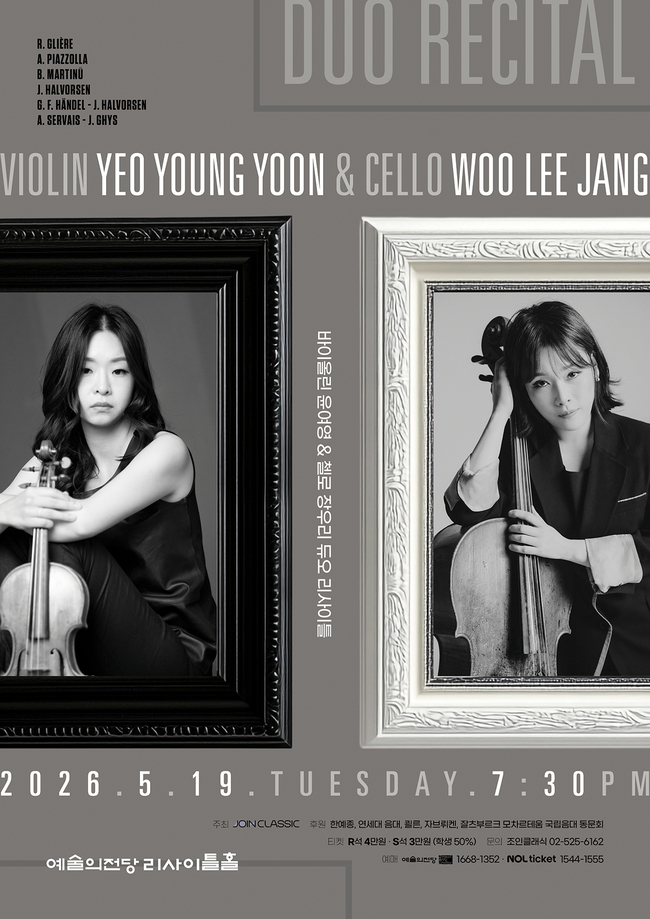 [시사뉴스 정춘옥 기자] 바이올리니스트 윤여영과 첼리스트 장우리가 오는 5월 19일(화) 오후 7시 30분, 예술의전당 리사이틀홀에서 듀오 리사이틀을 연다. 이번 공연은 피아노 없이 오직 바이올린과 첼로 두 악기만으로 구성된 프로그램이다. 바이올린의 선명한 고음과 첼로의 풍부한 저음이 어우러지는 균형 잡힌 음향이 돋보인다.