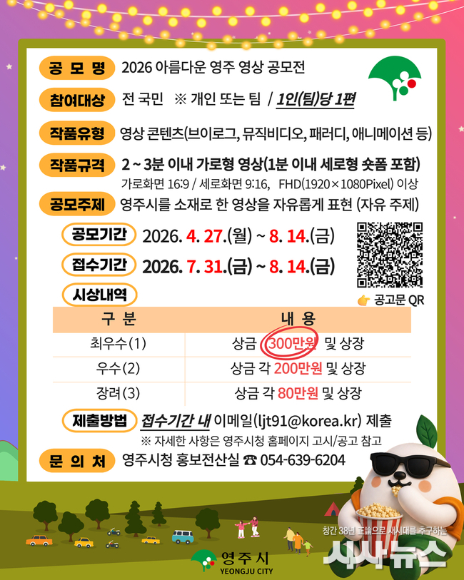 [시사뉴스 장시목 기자]경북 영주시는 영주를 소재로 한 참신한 홍보 콘텐츠를 발굴하고 시 홍보에 널리 활용하기 위해 「2026 아름다운 영주 영상 공모전」을 개최한다.