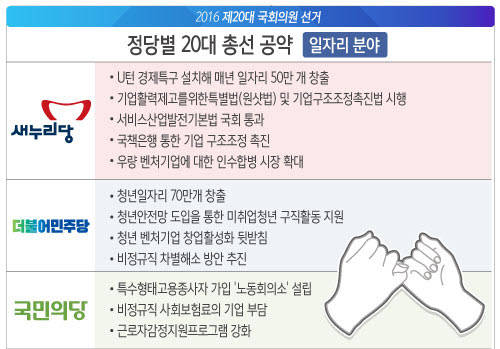일자리 공약도 온도 차가 있다. 새누리당은 내수산업 활성화와 미래성장동력 육성을 일자리 문제 해법으로 제시하지만 더민주당는 청년일자리 만들기에 집중했다. 국민의당은 신성장산업을 육성해야 한다고 했으며 정의당은 일자리 나눔을 강조했다.