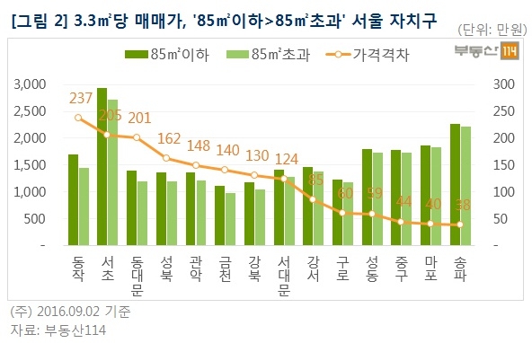 12일 부동산114에 따르면 지난 2일 서울 25개 자치구 중 절반이 넘는 14개 구에서 소형아파트(85㎡ 이하)의 3.3㎡당 매매가격이 대형아파트(85㎡ 초과)를 앞질렀다.