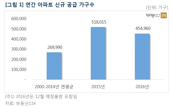 부동산114 관계자는 "신규 공급물량 대부분이 2017~2018년 입주하는 것을 감안하면 향후 2년간 입주물량이 크게 늘면서 지역에 따라 공급과잉이 현실화할 가능성이 있다"고 전망했다.