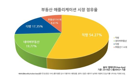 직방은 점유율에서도 1위를 유지했다. 모바일 앱 조사기관 앱애니에 따르면 지난해 12월 월간활성이용자수(MAU) 기준으로 부동산 중개앱 시장에서 직방이 차지하는 점유율은 59%에 달한다.