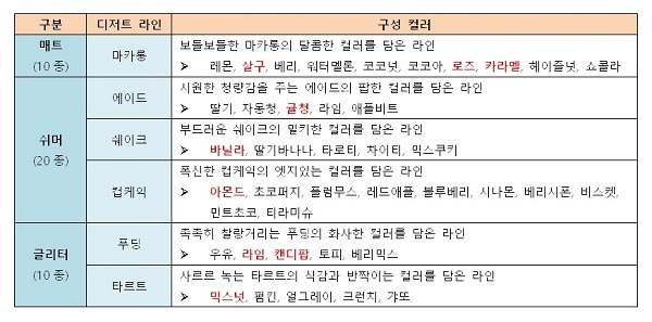 새롭게 선보인 스킨푸드 ‘마이 디저트 파티 아이섀도우’는 디저트를 연상시키는 생동감 넘치는 다양한 40가지 컬러구성에 촉촉하고 부드러운 촉감을 그대로 재현한 싱글 아이섀도우다. 컵케익 모양이 아이섀도우 위에 조각돼 있으며 마카롱, 에이드, 쉐이크, 컵케익, 푸딩, 타르트 6가지로 나눠 구성됐다.