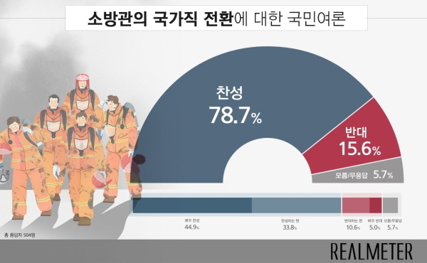 여론조사 기관 리얼미터는 오마이뉴스 의뢰로 현재 지방직 신분인 소방관의 국가직 전환에 대한 여론조사를 실시한 결과 찬성 의견이 78.7%에 달하는 반면 반대 응답은 15.6%에 불과한 것으로 나타났다고 10일 밝혔다.