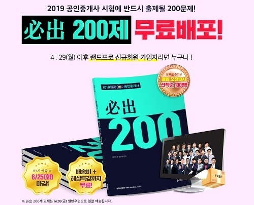 이번 공인중개사 교재 무료배포 이벤트는 4월 29일(월) 이후 랜드프로 홈페이지에 신규 가입한 회원 누구나 참가 대상이다. 이벤트 기간 중 가입을 마친 신규회원은 매일 오전 10시 이벤트에 응모할 수 있다. 매일 선착순 100명에게 ‘필출200제’가 무료로 제공된다.