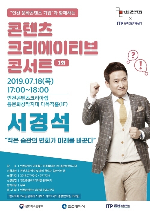 [시사뉴스 윤호영 기자] 문화체육관광부와 인천광역시가 주최하고 (재)인천테크노파크가 주관하는 인천콘텐츠코리아랩(틈문화창작지대)에서는 오는 7월 18일 목요일 오후 5시부터 제1회 ‘콘텐츠 크리에이티브 콘서트’를 개최한다.