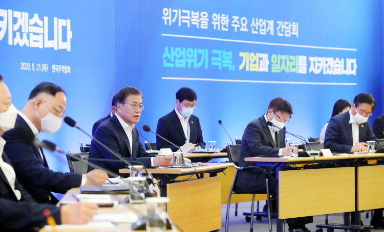 문 대통령은 이날 모두발언에서 "정부와 경제계 간의 협력은 물론 업종 간, 대기업과 중소기업 간, 노사 간 협력이 절실하다"며 "산업 생태계 전체를 지킨다는 비상한 각오로 일자리를 지키고 우리 산업과 경제를 반드시 살려야 한다"고 강조했다.