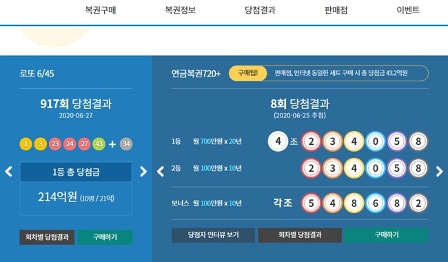 이날 917회 로또복권 추첨에서 1등 당첨번호는 '1, 3, 23, 24, 27, 43', 2등 보너스 번호는 ‘34’로 나왔다.