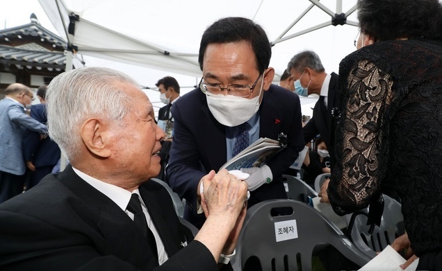 주 원내대표는 이날 오전 서울 종로구 이화장에서 열린 이 전 대통령의 추모식에 참석해 "(이 전 대통령은) 대한제국 말기에 애국독립운동, 일제하의 독립운동과 상해임시정부 수립 등 건국 대통령으로서 너무 크신 업적(을 세웠다)"며 "그 중에서도 가장 소중한 건 시장경제와 자유민주주의 대한민국의 초석을 놓은 일"이라고 평가했다.