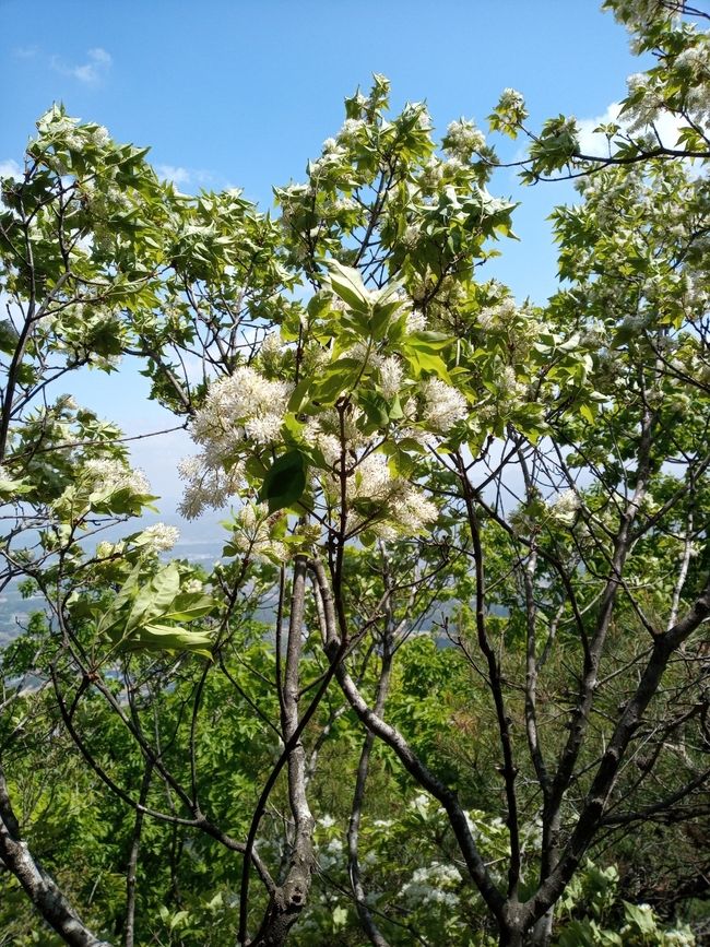 능선을 따라 오를수록 바람이 세차고, 그 세찬 바람에 흔들리는 연약한 나무의 꽃 이름이 궁금하여 찾아보니 물푸레나무 꽃이다. 이 나무를 태운 재를 물에 풀어 염료로 사용하면 푸르스름한 잿빛 물이 드는데, 예전에는 승려의 옷을 만들 때 주로 사용하였다 한다. 이곳저곳 피어있는 이름 모를 들꽃들도 찾아보며 오르는 중 마침내 능선 양옆으로 바라다보이는 경치는 감탄을 자아내게 한다.