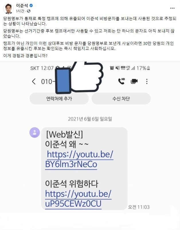 30만 당원들에 李 비방 내용 문자 전송 논란