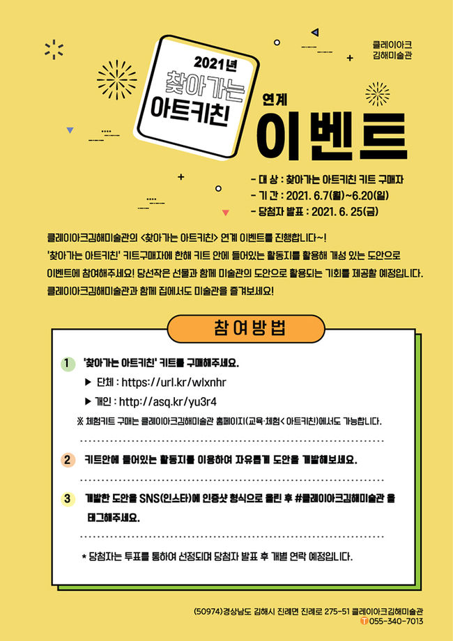 이번 이벤트는 ‘찾아가는 아트키친 키트’ 구매자에 한해 참여 할 수 있다. 클레이아크김해미술관 아트숍에서 ‘아트키친 타일 액자 키트’를 구매, 키트 안에 들어있는 활동지에 도안을 개발한 후 인스타그램 인증샷 업로드 시 ‘#클레이아크김해미술관’을 태그하면 된다. 응모는 오는 20일까지며, 발표는 25일이다. 당첨자에게는 소정의 선물을 증정하며, 선정 도안은 추후 아트키친 체험 시 활용될 예정이다.