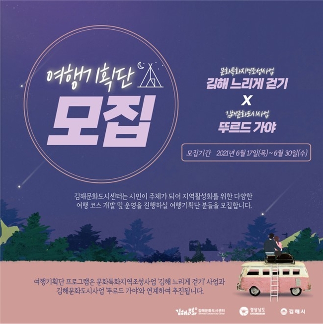 [시사뉴스 정윤철 기자] (재)김해문화재단 김해문화도시센터는 2021년 문화특화지역조성사업 및 문화도시조성사업의 일환으로 지역 활성화를 위한 다양한 여행 코스를 개발할 ‘여행기획단’을 모집한다.