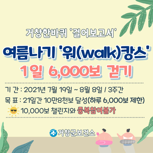 [시사뉴스 정윤철 기자] 거창군은 코로나19 장기화로 신체활동이 감소되고 있는 지역주민을 대상으로 일상 속 걷기 운동을 유도하기 위해 워크온 앱을 활용한 ‘여름나기 워(walk)캉스 걷기 챌린지’를 오는 19일부터 3주간 운영한다.