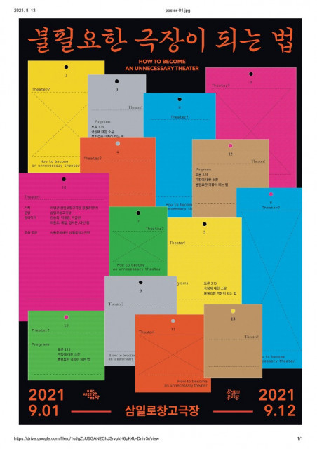 이번 프로그램은 팬데믹으로 계속 변화하는 창작 환경 속에서 동시대 공연 예술 플랫폼인 삼일로창고극장의 역할을 찾기 위해 현장 전문가로 구성된 공동 운영단과 함께 기획했다. ‘불필요한 극장’과 관련한 화두를 문학·시각·무용·연극 등 다양한 예술 장르를 통해 수집·기록·작품화해 역설적으로 극장이 이 시대에 필요한 이유를 말한다.