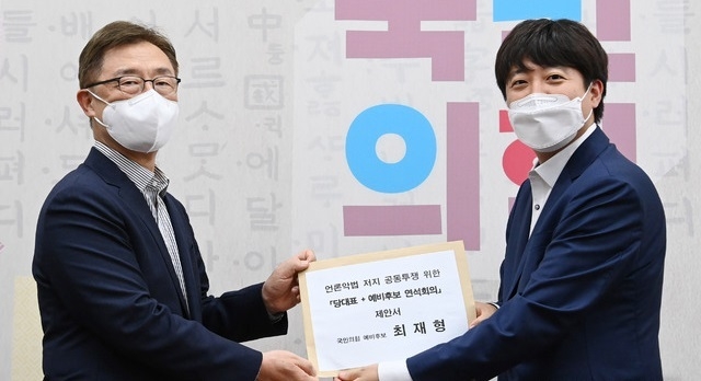 가장 먼저 집단 행동을 촉구한 건 최재형 전 감사원장이다. 최 전 원장은 23일 오전 서울 여의도 국회에서 이준석 대표를 만나 언론중재법 개정안 처리 저지를 위한 당 대표와 대선 예비후보 연석회의를 제안했다.