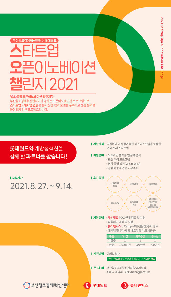 [시사뉴스 정윤철 기자] 부산창조경제혁신센터(센터장 송용준,이하 부산센터)는 롯데월드, 롯데벤처스와 함께 오픈이노베이션(개방형 혁신)을 함께 이끌어 나갈 유망 스타트업을 발굴‧육성하기 위해 ‘스타트업 오픈이노베이션 챌린지 2021’을 본격 가동한다고 밝혔다.