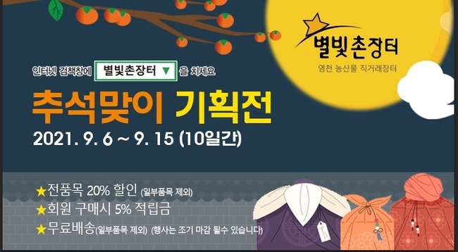 [시사뉴스 강준민 기자] 영천시(시장 최기문)는 농·특산물 온라인 쇼핑몰인 ‘별빛촌장터’에서 2021년 추석맞이 할인행사를 오는 6일부터 15일까지 총 10일간 실시한다.