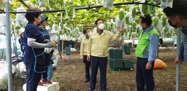 [시사뉴스 정윤철 기자] 조근제 함안군수가 지난 2일 새로운 지역 고소득작목으로 육성하고 있는 ‘샤인머스켓’ 포도의 본격적인 출하기를 맞아 칠북면 이령리 일원의 수확현장을 방문해 농가를 격려하고 있다.