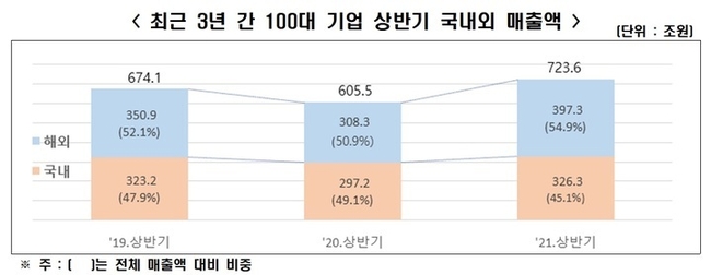 국내 100대 기업들의 올해 상반기 총 매출액은 723.6조원으로 코로나19 이전인 2019년 상반기 674.1조원 대비 49조5000억원 늘어났으며, 이 중 46조4000억원이 해외시장에서 발생했다. 반면, 국내매출 증가분은 3조1000억원(6.3%)에 불과했다.
