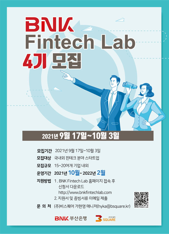 [시사뉴스 정윤철 기자] BNK부산은행이 핀테크 분야 스타트업을 육성·발굴하기 위해 ‘BNK핀테크랩 4기’를 모집한다고 밝혔다.