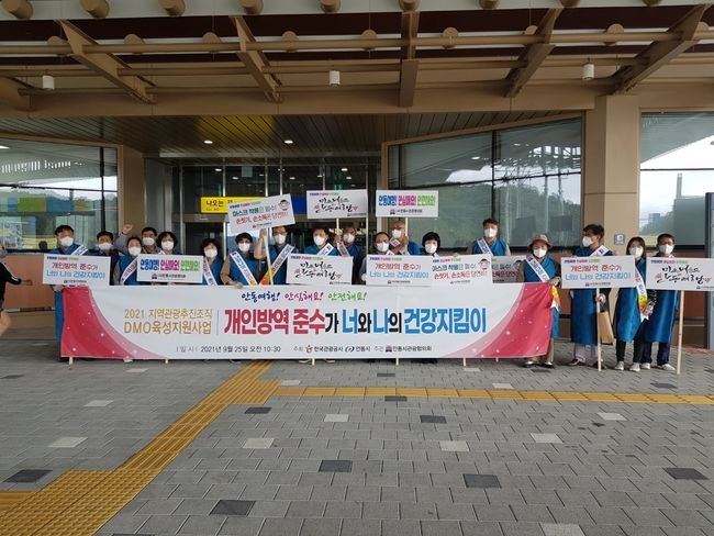 이날 캠페인은 안동여행 관문인 KTX안동역과 안동터미널 그리고 좁은 공간에 가장 많은 관광객이 모여 밀집도가 높은 낙강물길공원, 만휴정에서 진행했다.