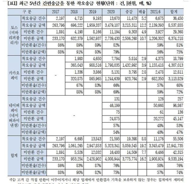 2015년 간편송금 시장에 처음 들어온 토스(비바리퍼블리카)는 5년간 85억3786만원, 3만6450건의 착오송금이 발생했고, 이중 63억7422만원(75%), 2만9368건(81%)이 미반환됐다. 2017년 2억6379만원, 2197건이던 착오송금이 지난해 34억7911만원, 1만3670건으로 각각 12.2배, 5.2배 증가했다.