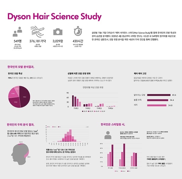 다이슨은 연구의 정확성을 높이기 위해 모발을 스캔해 분석하는 ‘헤어 곡률 분석 도구(Hair Curvature Analysis Tool)’를 개발했다. 20~50대 참가자로부터 모발을 채취한 결과, 참가자의 73%는 1형, 2형 모발이다. 헤어 곡률 분석 도구로 분류한 모발은 곡률의 정도에 따라 1형에서 4형으로 구분된다. 1형 모발의 경우 낮은 곡률의 형태를 보이며, 4형에 가까울수록 모발의 곡률이 커진다.