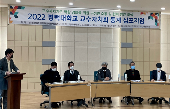 [시사뉴스 서태호 기자] 평택대학교 사학혁신지원사업단(단장 이동현)은 1월 26일(수) 본교 e-컨버젼스 홀에서 평택대학교 교수자치회 주관으로 ‘교수자치기구 역할 강화를 위한 구성원 소통 및 협력 방안 모색’이라는 주제의 동계 심포지엄을 개최하였다.