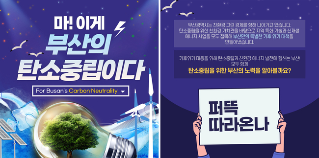그는 이 작품에서 부산이 탄소중립을 위해 추진하고 있는 다양한 노력들을 부산 사투리를 활용해 10컷의 카드뉴스 이미지로 정감 있고 알기 쉽게 표현해내 창의성, 완성도 등을 인정받았다.