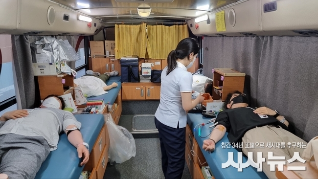 이동식 헌혈 버스에서 헌혈에 참여한 임직원들은 마스크 착용, 체온 측정, 손소독 등 감염병 예방 수칙을 철저히 지키며 캠페인에 참여했다.