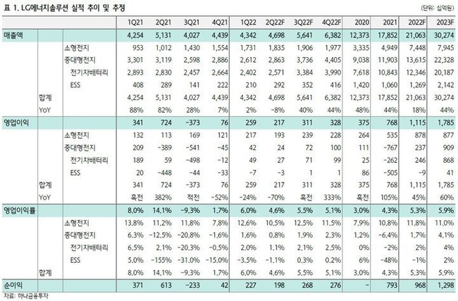 이는 ▲2분기 초 메탈 가격 상승에 대한 판가 전가 시점까지의 시차 ▲판가가 전가되지 않는 일부 메탈 가격 상승 ▲상대적 고 수익성 제품인 테슬라향 원통형 전지 부문 매출 증가폭 등 상하이 봉쇄 영향으로 예상보다 작은 데 있다고 설명했다. 또한, 이익 증가폭은 약 5000억원 수준일 것으로 예상했다.