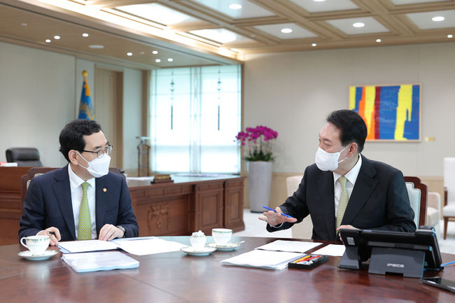 이날 업무보고는 부처 관계자 배석 없이 두 장관이 윤 대통령에게 독대 보고하는 형식으로 진행됐다. 대통령실에서는 김대기 비서실장, 최상목 경제수석비서관, 강인선 대변인이 배석했다.