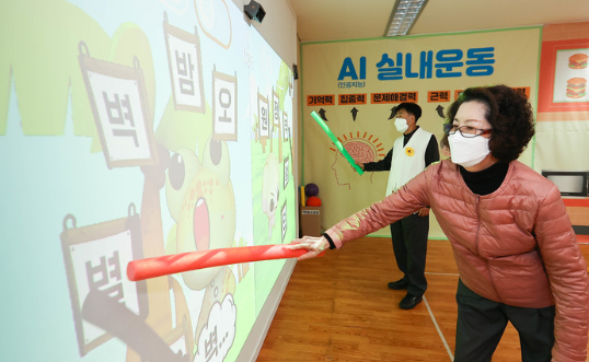 AI 실내운동체험은 현실 공간에 반응형 기술과 위치나 동작 인식이 가능한 센서를 연동해 제공하는 서비스로 별도 기기 착용 없이 어르신들이 메타버스 환경을 활용해 게임형 콘텐츠를 즐길 수 있다. 막대와 공을 이용해 31가지 게임(2인용 게임 5개 포함)을 즐기며 신체 능력을 향상시키고 인지능력도 키울 수 있는 것이 특징이다.