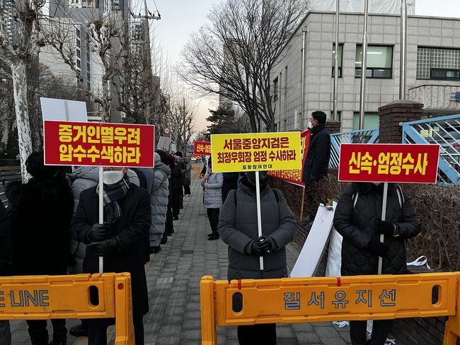 [시사뉴스 김정기 기자] 포항시민 50여명이 포스코 최정우 회장에 대한 신속하고 엄정한 수사를 촉구하며 서울 수서경찰서 앞에서 10일 오전7시 40분부터 상경 시위를 전개하고 있다.