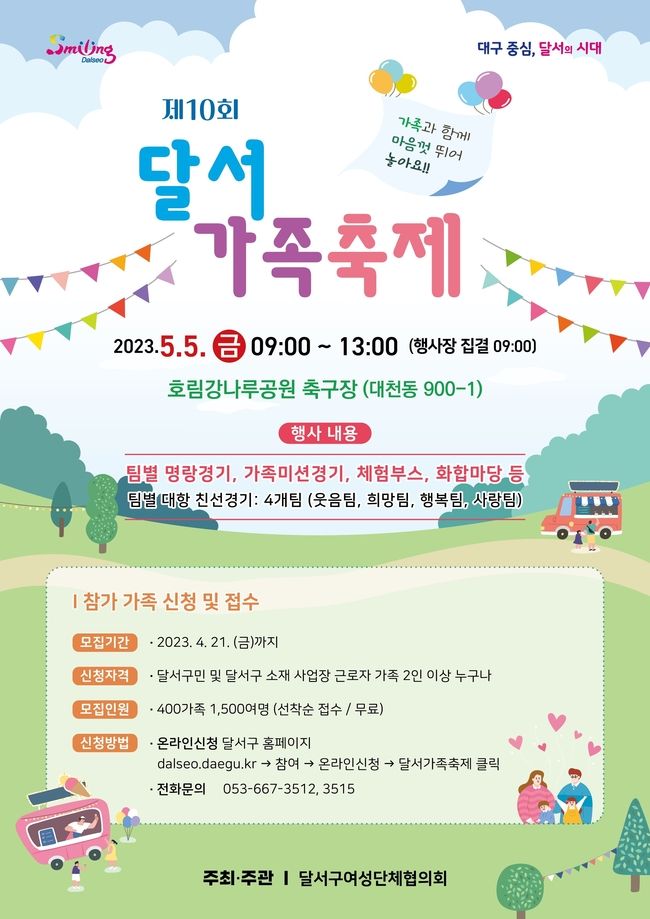 신청자격은 달서구민 및 달서구 소재 사업장 근로자 가족 2인 이상이면 누구나 가능하며 4월 21일까지 달서구 홈페이지를 통해 신청하면 된다. 참가비는 무료이다.