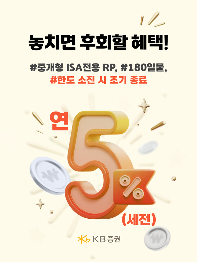 현재, KB증권에서는 중개형 ISA를 처음 시작하는 투자자들을 위해 ‘KB증권 중개형 ISA 전용 세전 연 5% 특판RP’를 제공하고 있다. 1인당 최대 1천만원 한도로 참여 가능하며, 오는 8월 30일(금)까지 KB증권 중개형 ISA 계좌를 신규 개설하거나 타사로부터 중개형 ISA 계좌 이전을 하는 고객이라면 누구나 매수할 수 있다. 이미 KB증권에 중개형 ISA 계좌를 가지고 있는 고객이라도 5월 31일 기준, 총 납입금액이 100만원 이하라면 매수 가능하다.