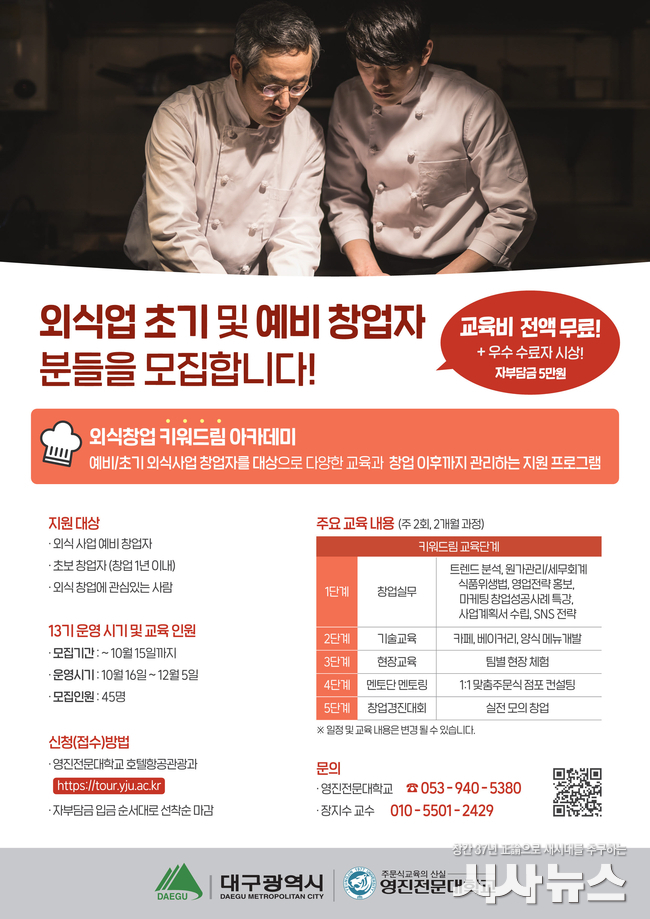 [시사뉴스 하정수 기자] 대구광역시는 외식업 예비창업자와 초기 창업자의 안정적 정착을 지원하기 위해 외식창업 ‘키워드림’ 아카데미 13기 참가자를 10월 15일까지 모집한다.