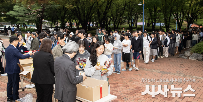 사진3: 14일 오후 영진전문대학교 도서관 앞에서 간식을 받기 위해 길게 줄을 선 학생들의 모습이 캠퍼스에 활기를 더하고 있다.