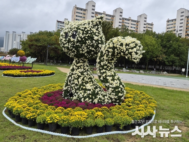 이번 국화전시는 옥곡동 생활 환경 숲과 맨발 걷기 산책로 인근 시정 구호 화단 약 800㎡에 3,300여 본의 국화와 곰돌이, 고양이, ‘아이러브유’ 조형물 3점을 설치해 다채로운 볼거리를 제공한다.