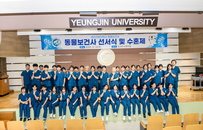 [시사뉴스 장시목 기자]영진전문대학교(총장 최재영) 동물보건과는 ‘2025 영진종합작품전’ 기간 중인 30일 교내 도서관 시청각실에서 ‘제3회 동물보건사 선서식 및 수혼제’를 개최했다고 31일 밝혔다.