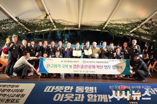[시사뉴스 장시목 기자]대구 달서구(구청장 이태훈)는 지난 31일 대구광역시 자율방범연합회(회장 김용환)와 초저출생 인구위기 극복을 위해 공동 대응하고,‘잘 만나보세’뉴(NEW) 새마을운동(결혼문화) 확산 등을 위한 업무 협약을 체결했다.