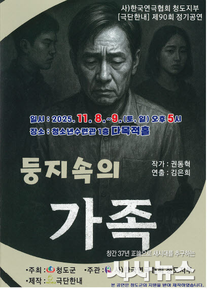 [시사뉴스 장시목 기자]청도군(군수 김하수)과 사)한국연극협회 청도지부(대표 박헌식)는 오는 11월 8일(토)부터 9일(일)까지 이틀간, 청도 청소년수련관 다목적홀에서 제90회 정기공연 「둥지속의 가족」을 선보인다. 이번 공연은 극단 한내가 제작을 맡았으며, 무료로 관람 가능하고 양일 모두 오후 5시에 막이 오른다.