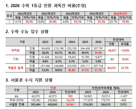 확률과 통계 접수자는 2025학년도 23만3111명에서 2026학년도 29만7726명으로 27.7% 증가했다. 반면 미적분 접수자는 같은 기간 24만4408명에서 20만7791명으로 15.0% 감소했다. 기하 접수자는 1만5677명으로 전년(1만5760명)과 유사한 수준을 보였다.