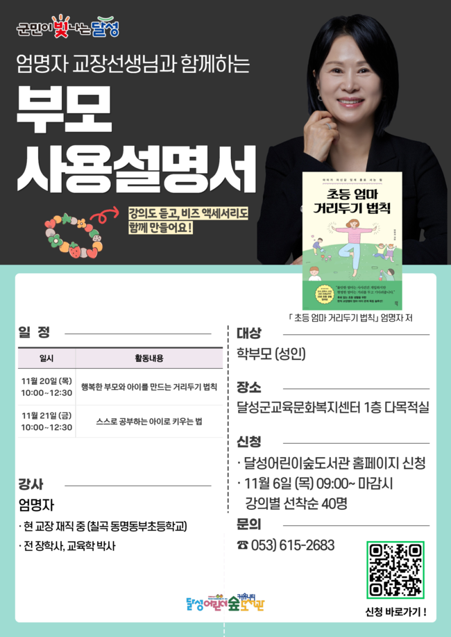 [시사뉴스 이성동 기자] 대구 달성어린이숲도서관(관장 장선희)이 오는 11월 20일과 21일 달성군 교육문화복지센터 1층 다목적 가족소통 교류공간에서 자녀 교육에 고민이 많은 학부모를 위해 특별 강연 프로그램 ‘부모 사용 설명서’를 개최한다.