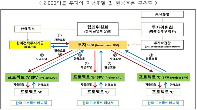 산업통상부는 14일 한미 전략적 투자 양해각서 서명에 대한 보도자료를 발표해 2000억불 투자에 대해 “미국은 전체 프로젝트 관리를 위한 ‘투자 SPV(특수목적법인: Special Purpose Vehicle)’를 설립하고 개별 프로젝트별로 ‘프로젝트 SPV’를 설립한다”며 “투자 수익 배분은 원리금 상환 전까지는 한국과 미국에 각각 5대 5의 비율로 배분되고 원리금 상환 이후부터는 한국과 미국에 각각 1대 9의 비율로 배분된다”고 밝혔다.